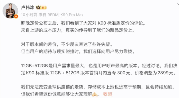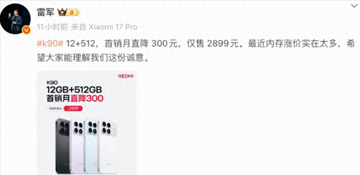 REDMI K90 昨天才发布权威配资之家官网,而就在今天——12GB+512GB 版本官方就官降 300 元,价格直接砍到 2899 元,这一下几乎把前代同配置拉平了。