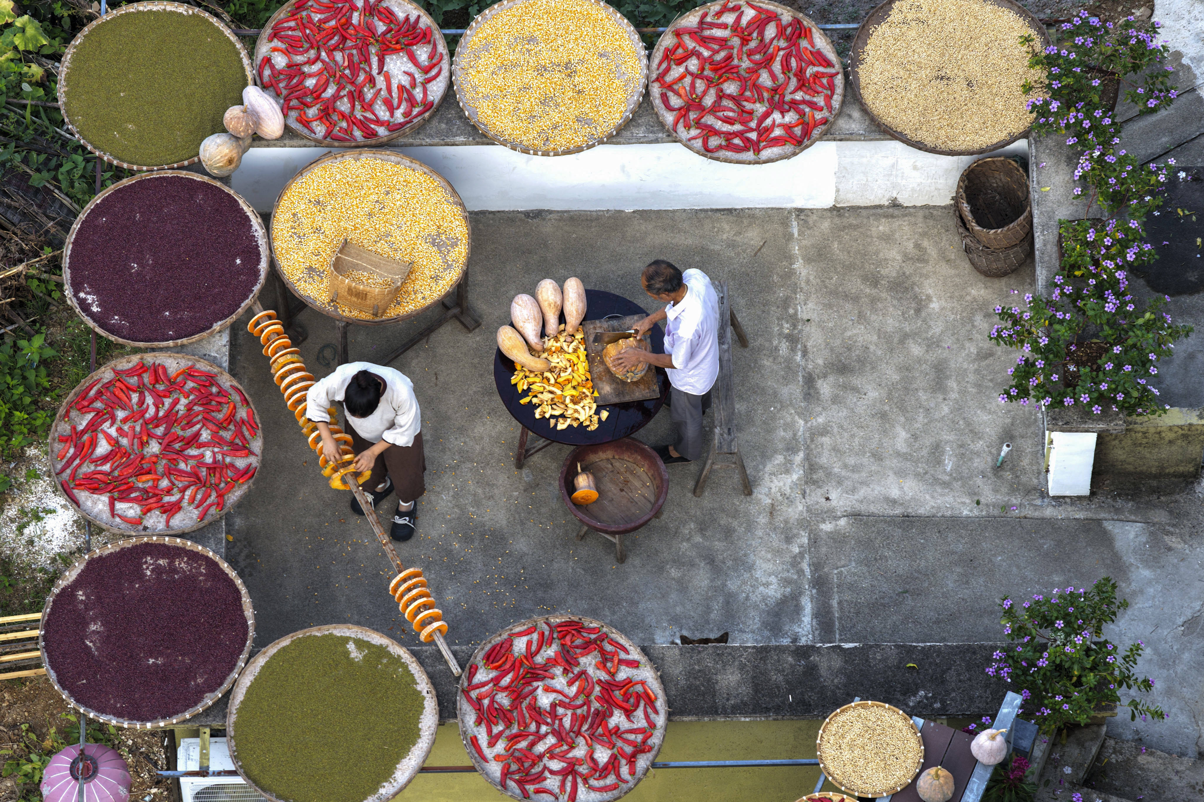 9月18日,阳产村村民在土楼前晾晒农作物(无人机照片)。新华社记者 黄博涵 摄秋分后