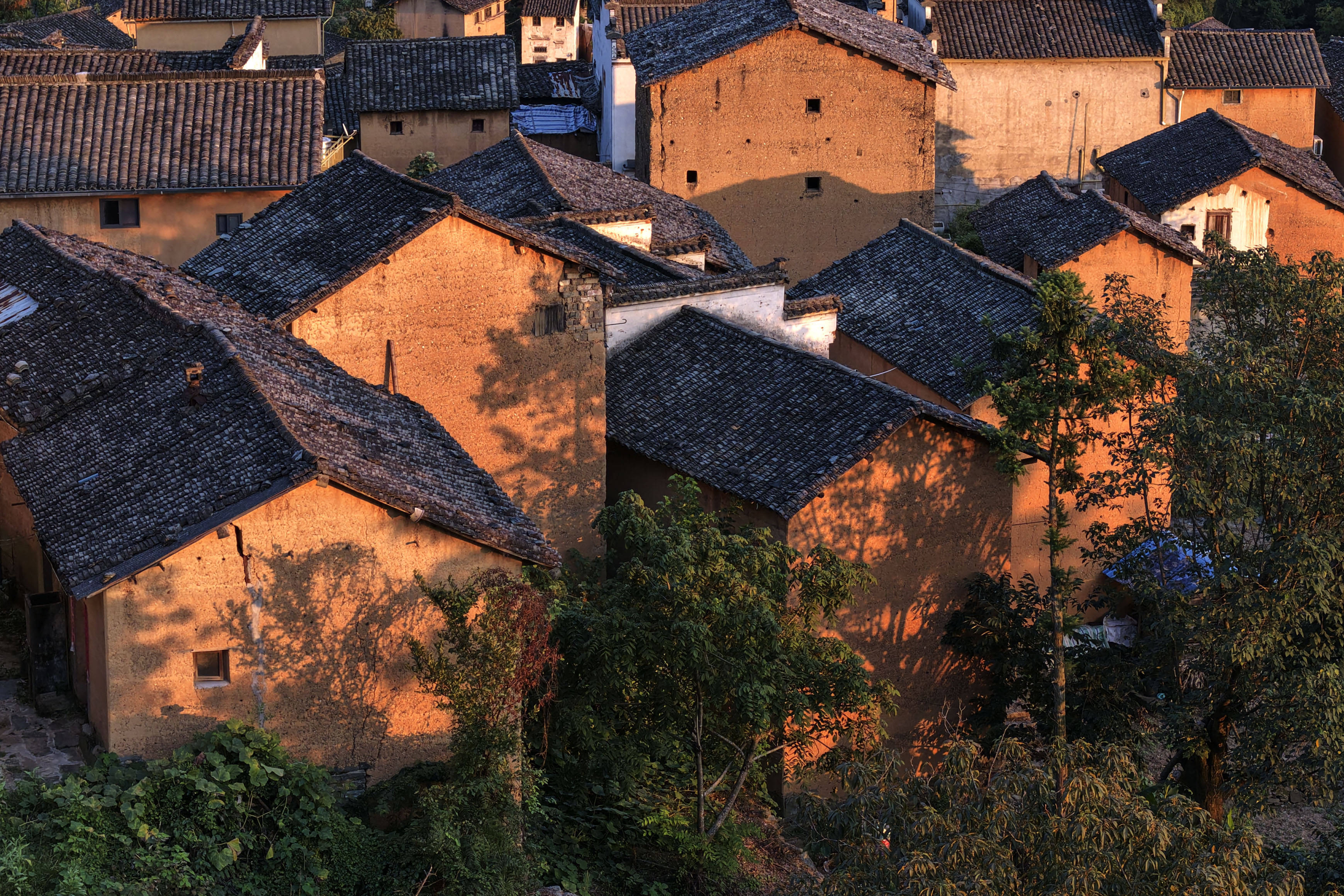 9月18日,夕阳照耀下,阳产村土楼树影婆娑(无人机照片)。新华社记者 黄博涵 摄秋分是一个充满诗意的时节