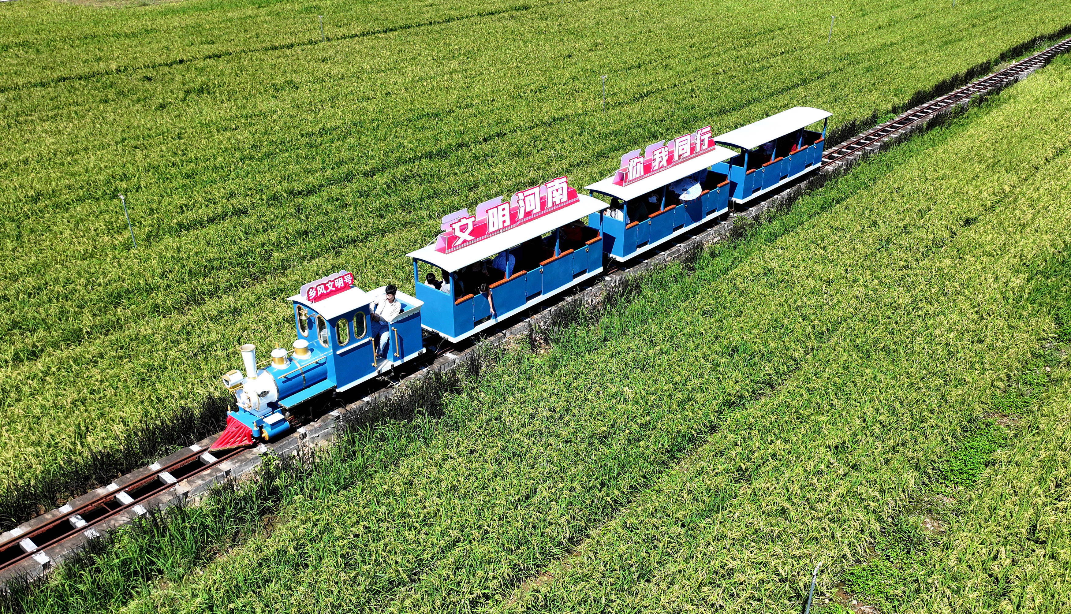 2025年9月20日,观光小火车在河南省洛阳市汝阳县三屯镇东保村“稻田小镇”穿行。新华社发(康红军摄)统筹:吴炜玲